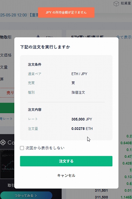 だけど、現金の表示が消えててビットコインの金額は増えてるから買えてる。