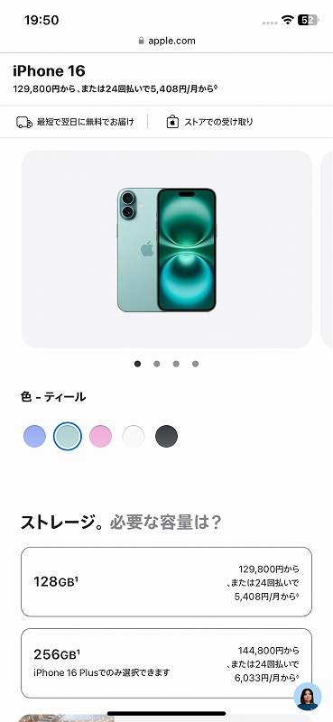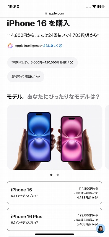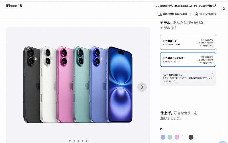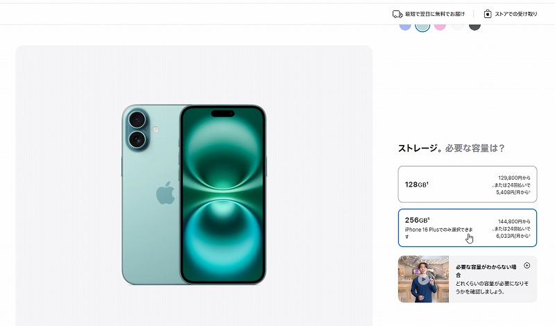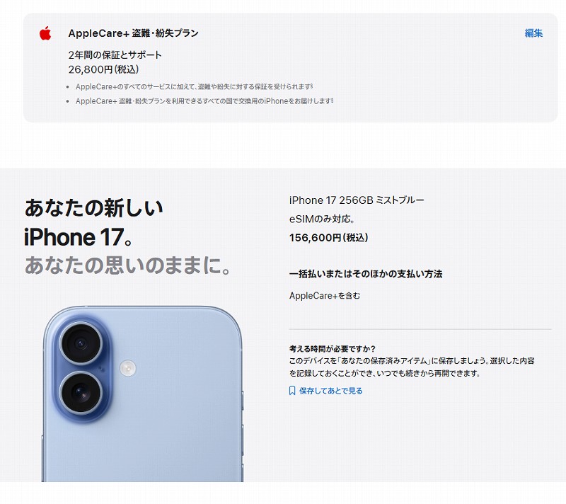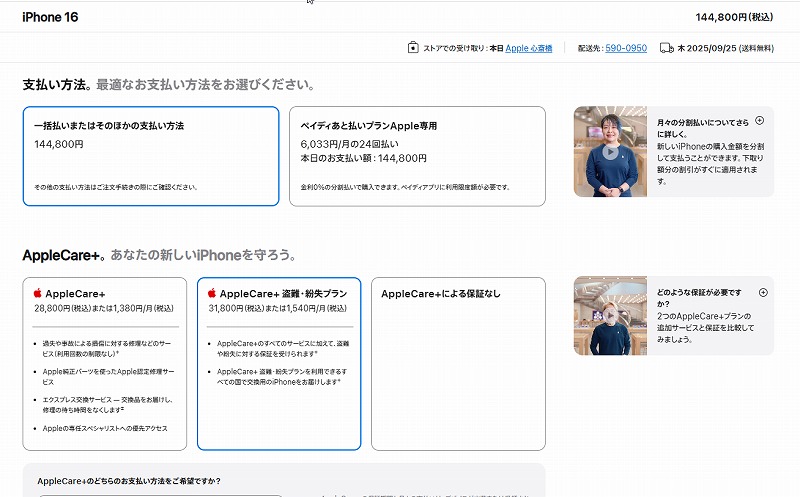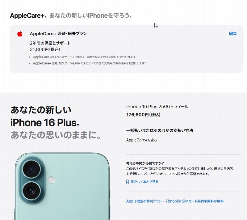 結果、iPhone16plus256G、に決まったけど本体144,800円。Appleケア紛失サポートに加入したら31,800円