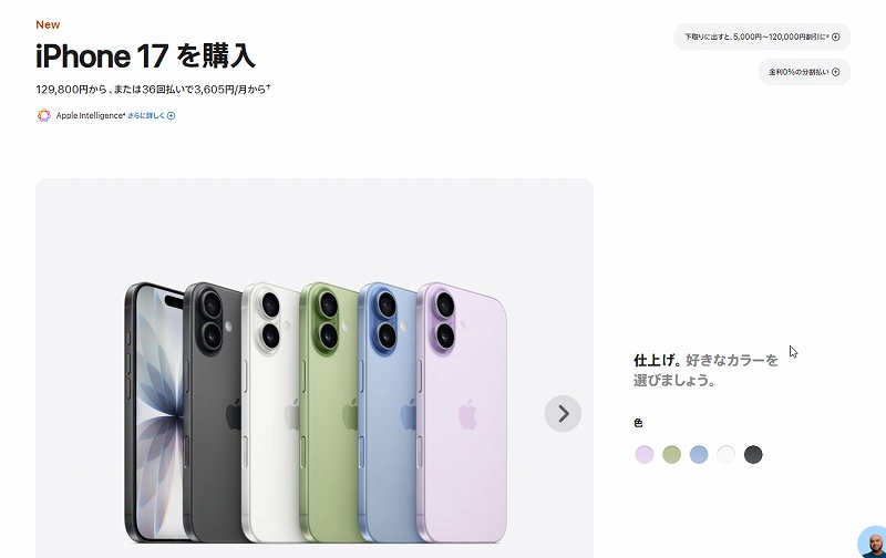 新発売のiPhone17なら初期値256Gなので156,600円と2万円安かった~