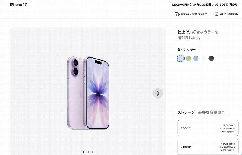 iPhone16とiPhone17の色の違いや、容量とその価格